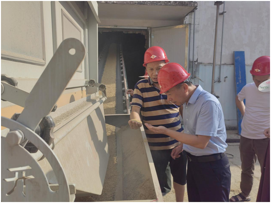 隨后,按照夏糧收購流程,雨民董事長全程考察了現(xiàn)場各個作業(yè)環(huán)節(jié),并聽取了三塘公司今年政府儲備糧輪換收購的情況匯報。在卸糧口,雨民董事長抓取輸送機上稻谷查看今年收購入庫稻谷質量,再三強調必須把好新糧入庫質量關,并叮囑現(xiàn)場作業(yè)人員一定要規(guī)范作業(yè),確保人員安全。
